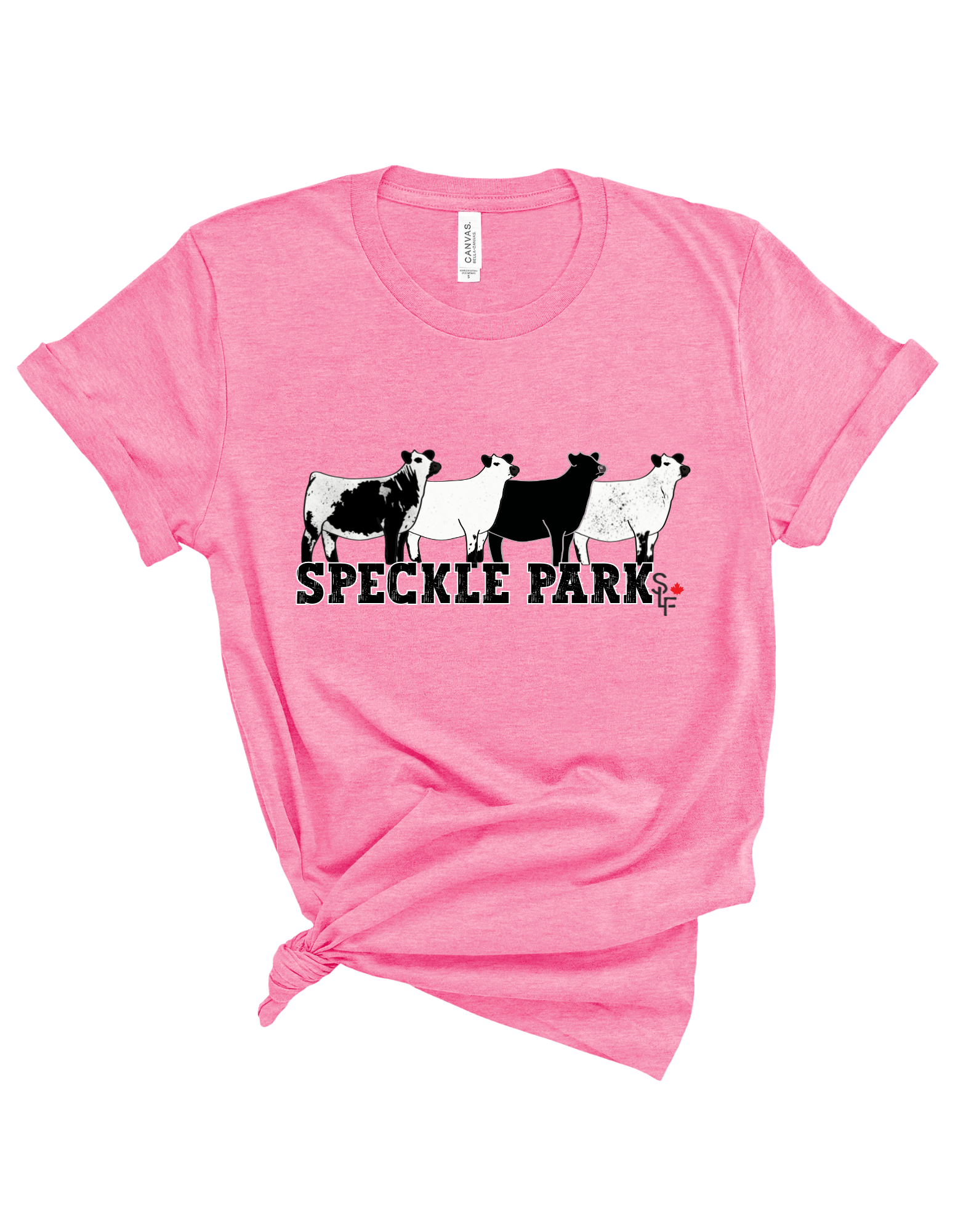 This tee features our custom Speckle Park 4 Heifer design, hand-pressed right here at Speckle Lane Farm.